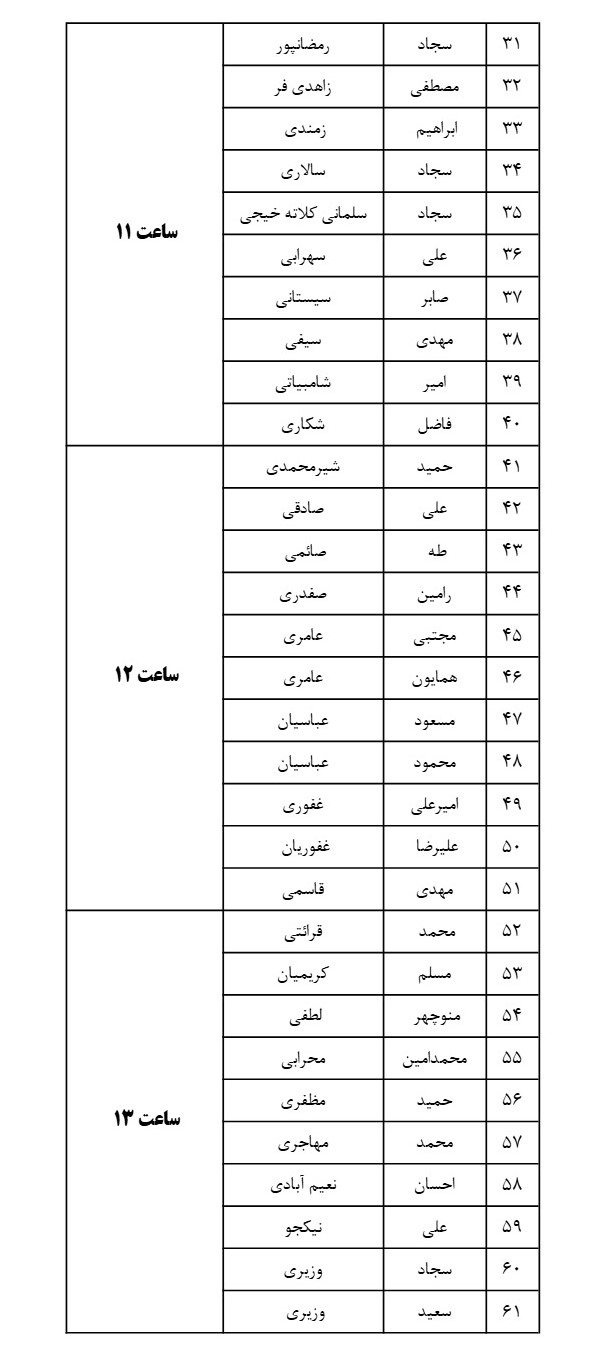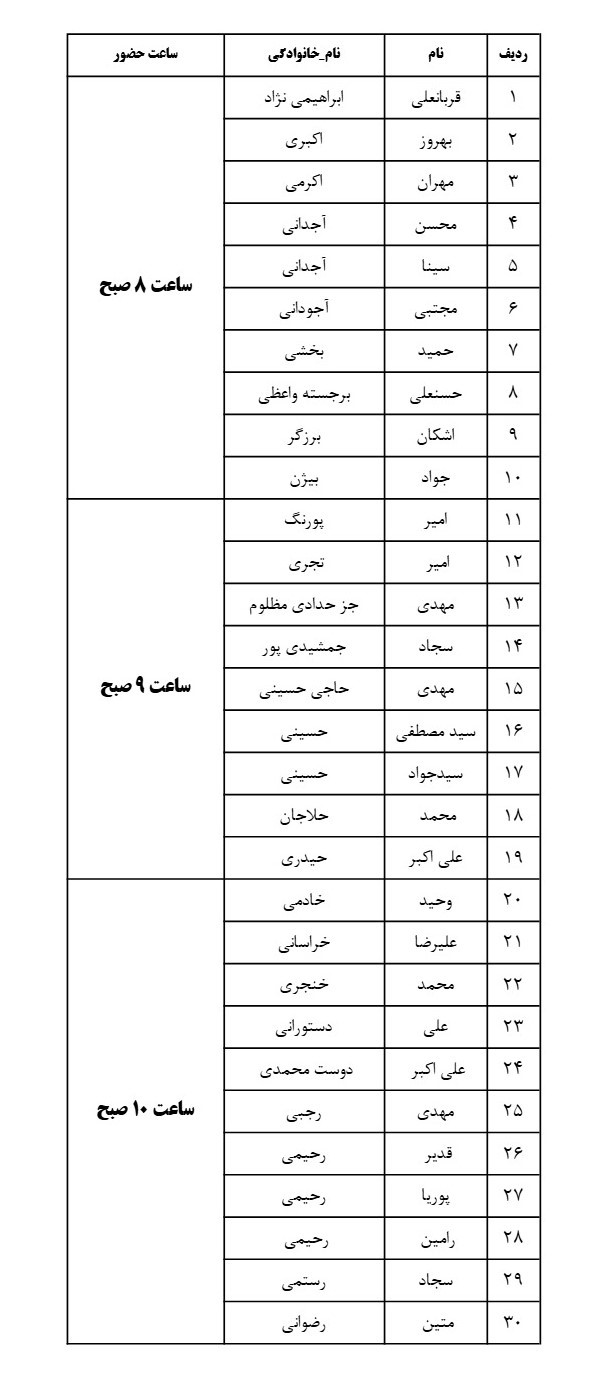 پیرو فراخوان بکارگیری نیروی تاسیسات و بررسی مدارک انجام شده به اطلاع شرکت کنندگان محترم می رساند جهت شرکت در مصاحبه تخصصی و عمومی در روز دوشنبه مورخ ۱۴۰۴/۰۸/۱۲ مطابق ساعت اعلام شده در لیست زیر با در دست داشتن کارت ملی یا شناسنامه به آدرس میدان هفتم تیر، دانشگاه علوم پزشکی، دانشکده پزشکی طبقه اول. سالن آموزش مجازی مراجعه نمایند.